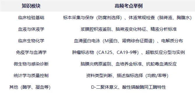 融合多学科知识:不仅考查检验技术本身,还涉及医学统计学、免疫学、生物化学、微生物学等交叉内容;