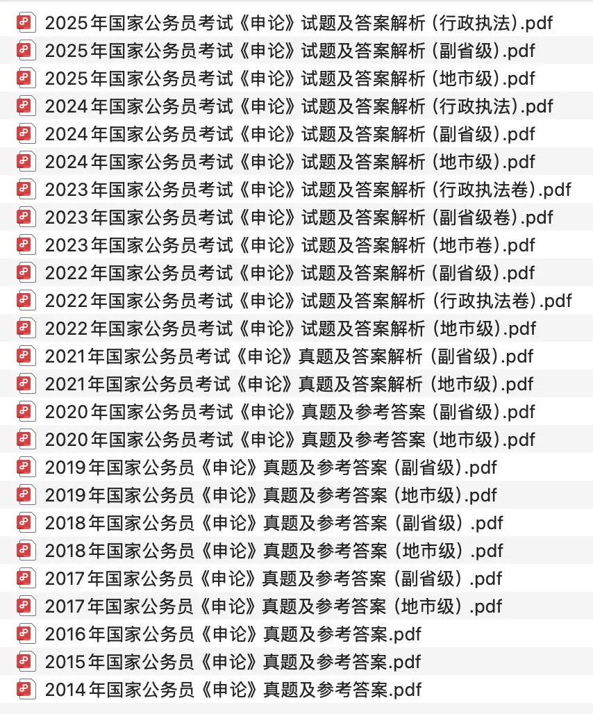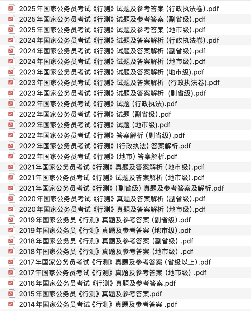 国家公务员考试笔试真题汇总:内含2014年—2025年国家公务员考试笔试真题,包含行测24套+申论24套,试题均有答案解析,并分开排版。试题来源于考生回忆及网络整理,仅供学习参考。后附有目录及部分内容截图。