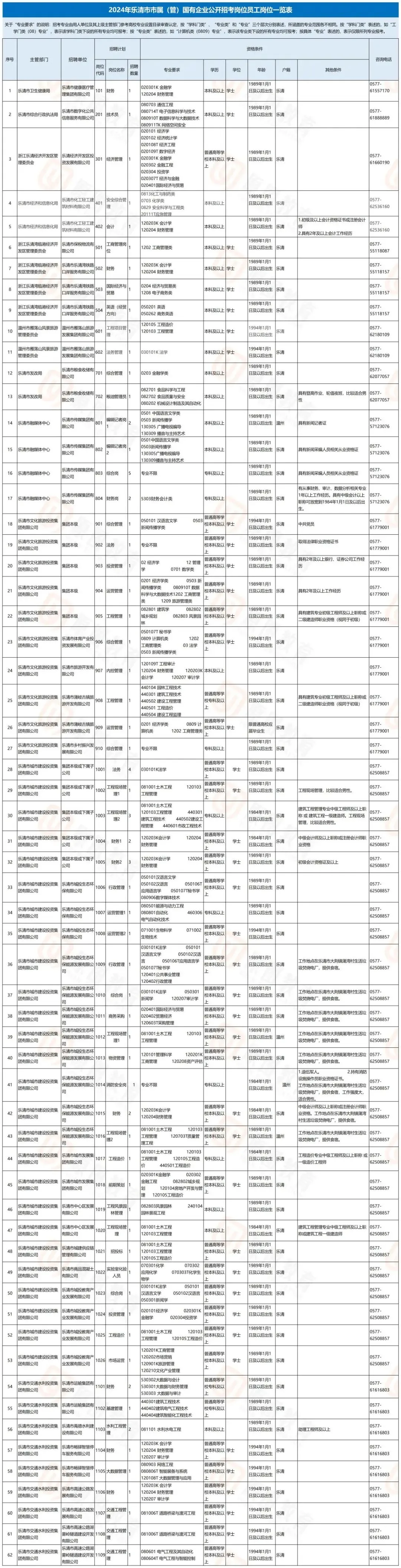 1.招考岗位要求详见《2024年乐清市市属(管)国有企业公开招考岗位员工岗位一览表》(附件1)。