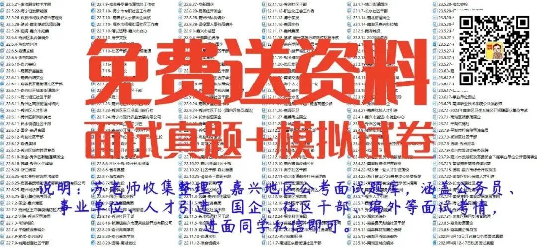 近期有些同学私信反映苏老师提供的面试资料有押中题,有些新考公同学可能不了情况误以为是“提前了解面试题目”,情况给新同学解释下:一是公考面试出题会紧扣当前的时政和社会热点,时政热点如总书记的讲话,社会现象如“出生率下降”“特种兵旅游”“互换式旅游”等等,苏老师平时会做很多热点的研发解析;二是嘉兴地区部分单位面试出题会出现一些别的地方已经考过的高度类似的面试题目,比如某道题目几个月前A县国企面试考过,后面B县国企或者编外面试又用这个类似的题目,苏老师平时会向很多考生交流面试情况,收集了解了本地面试题目库。综合上述两点情况,所以会有偶尔押中题目的情况。面试学习和面试研发一样,需要平时多下功夫,久久为功、默默留意才能有收获。本周2个真题面试热点分享给大家。