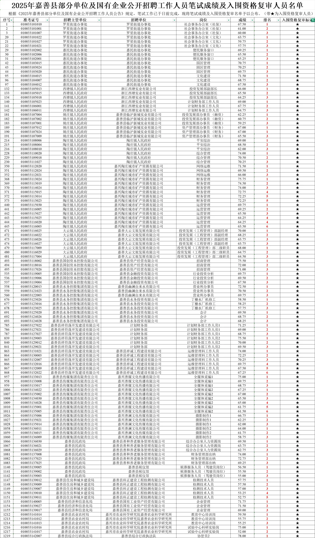 附件:2025年嘉善县部分单位及国有企业公开招聘工作人员笔试成绩及入围资格复审人员名单