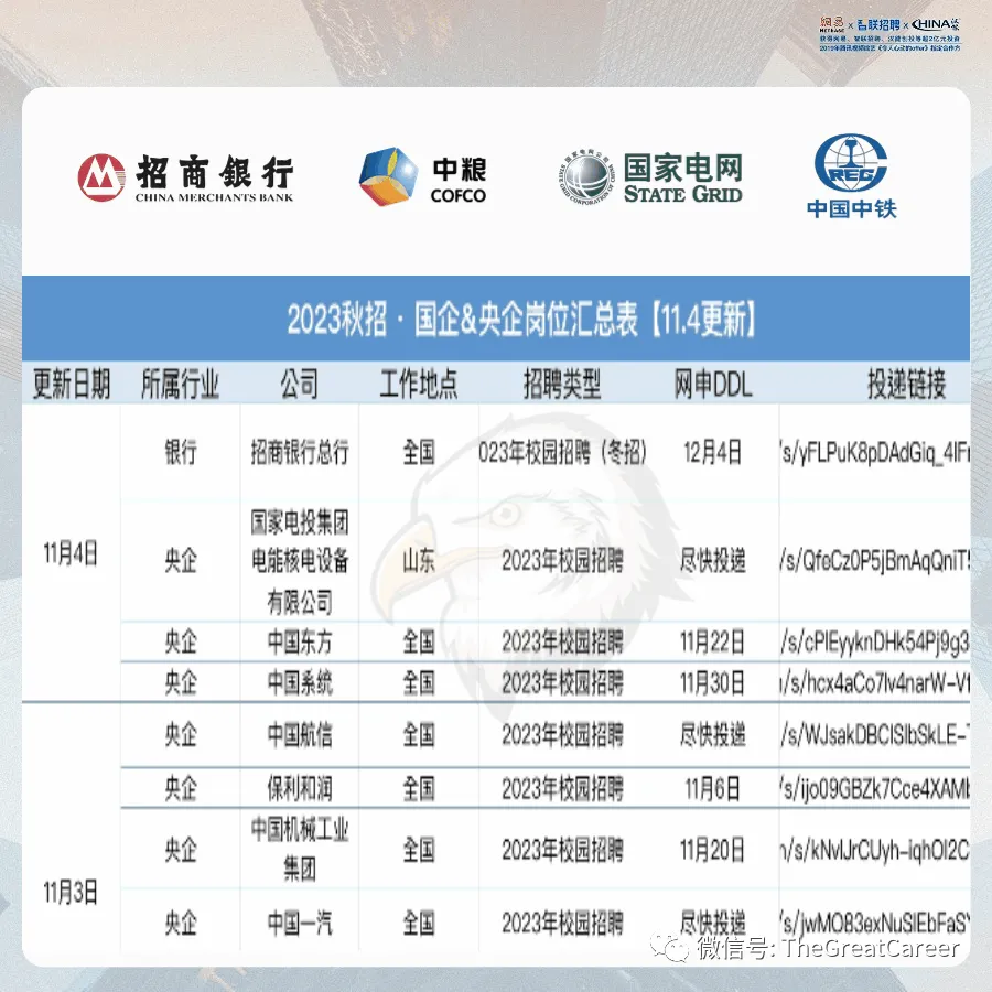 部分国企几乎在本月都将截止网申,因此求职国企的同学要抓紧时间投递了!包含: 100+国企/央企校招,共计2000+岗位