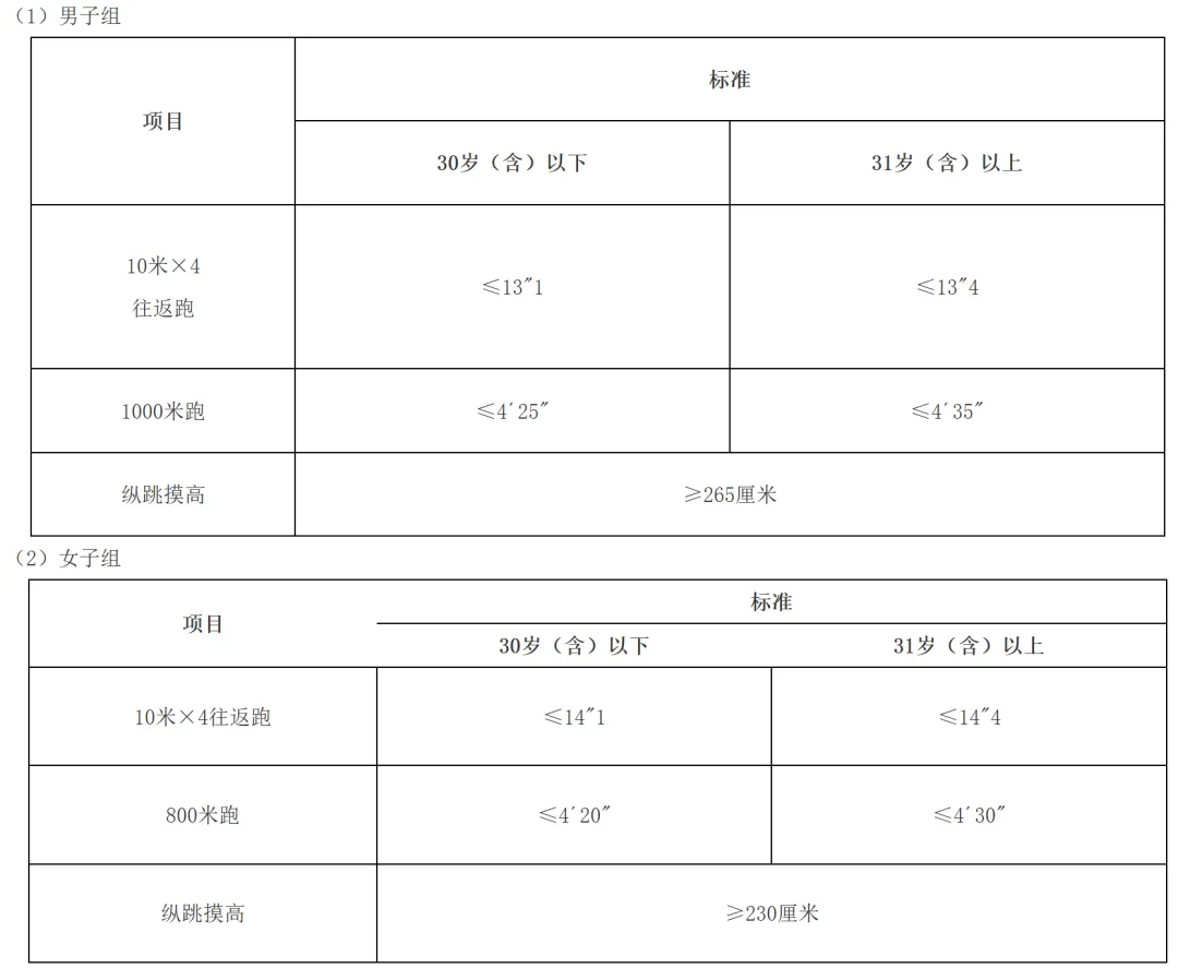 2.体能测试内容:体能测试标准参照《公安机关录用人民警察体能测评项目和标准》执行。