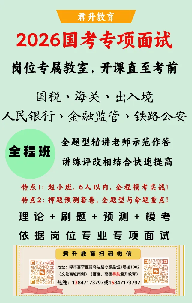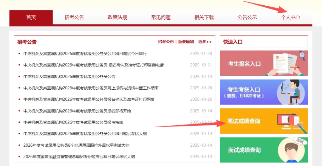 请👆或👇关注“内蒙君升”。君升教育专注国考、省考、事业编、遴选比选选调、人才引进、央企国企等各类考录面试培训,知考情懂命题,专一面试所以专业。电微13847173797/15847173797各岗位历年考场真题及2026考编资料获取扫码加友:根据公告,报考者可在2026年1月通过官方专题网站查询。结合2024—2025年的招录规律,成绩发布时间通常距笔试约45天,2026年国考成绩大概率1月15日左右公布。国考成绩查询也是在报名的专题网站进行,输入账号和密码登录,即可查询国考成绩。http://bm.scs.gov.cn/pp/gkweb/core/web/ui/business/home/gkhome.html根据2026年国考公告要求,不同类型的职位,成绩计算方式不同。