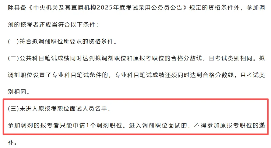 且入围名单里的排序,并非是按照排名来的。国考不公布排名,入面名单上面的顺序是按照准考证号的顺序排列的,不代表具体排名。进面名单上同岗位所有人的分数都显示为“最低面试分数”,看不到单人具体分数,若自己分数刚好为进面分,则有可能是该岗位的最后一名。进群,群内发进面名单。面试名单公布后,会在1~2天内发布调剂公告和调剂职位表,未进入首批面试名单的考生可以参与岗位调剂。参与调剂的报考者,需满足调剂岗位的报考条件,且笔试成绩同时达到拟调剂职位和原报考职位的合格分数线,且考试科目相同。调剂审查结束后,会再发一次调剂职位面试入围名单。(以2025年为例)