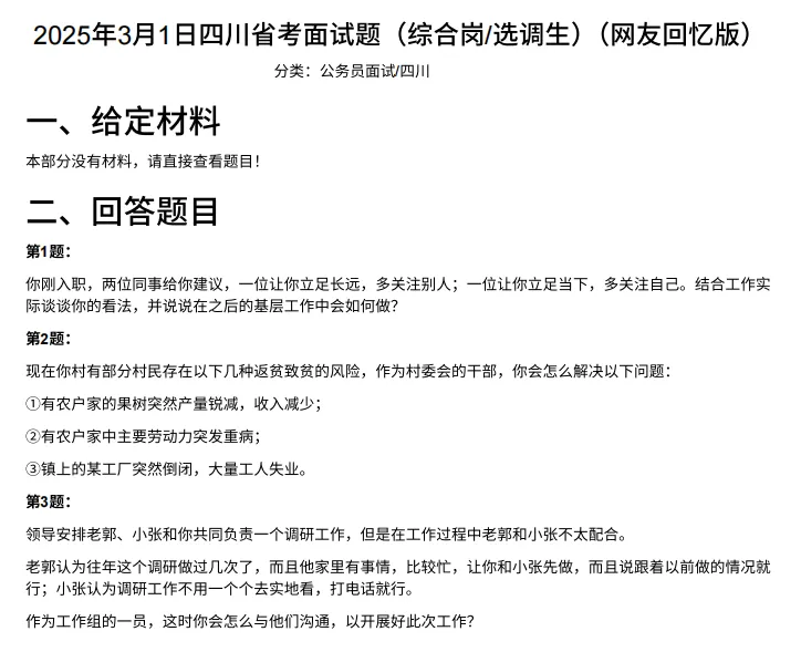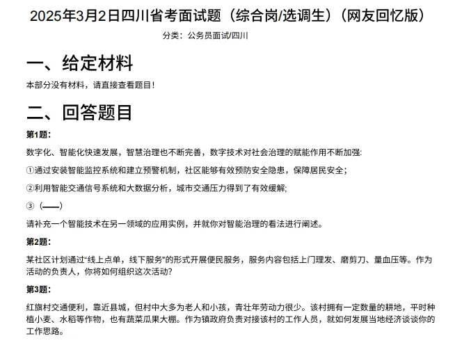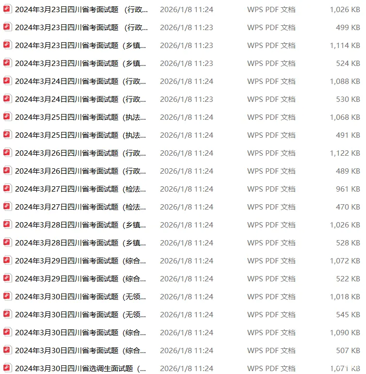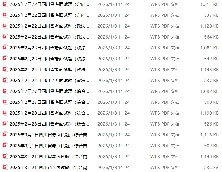 四川省考笔试成绩已公布,排名即将发布。为帮助各位考生提前高效备考面试,我们特准备了 2020-2025年近6年四川省考面试真题及详细解析(共200套) 。抓住关键准备期,赢在面试起跑线。