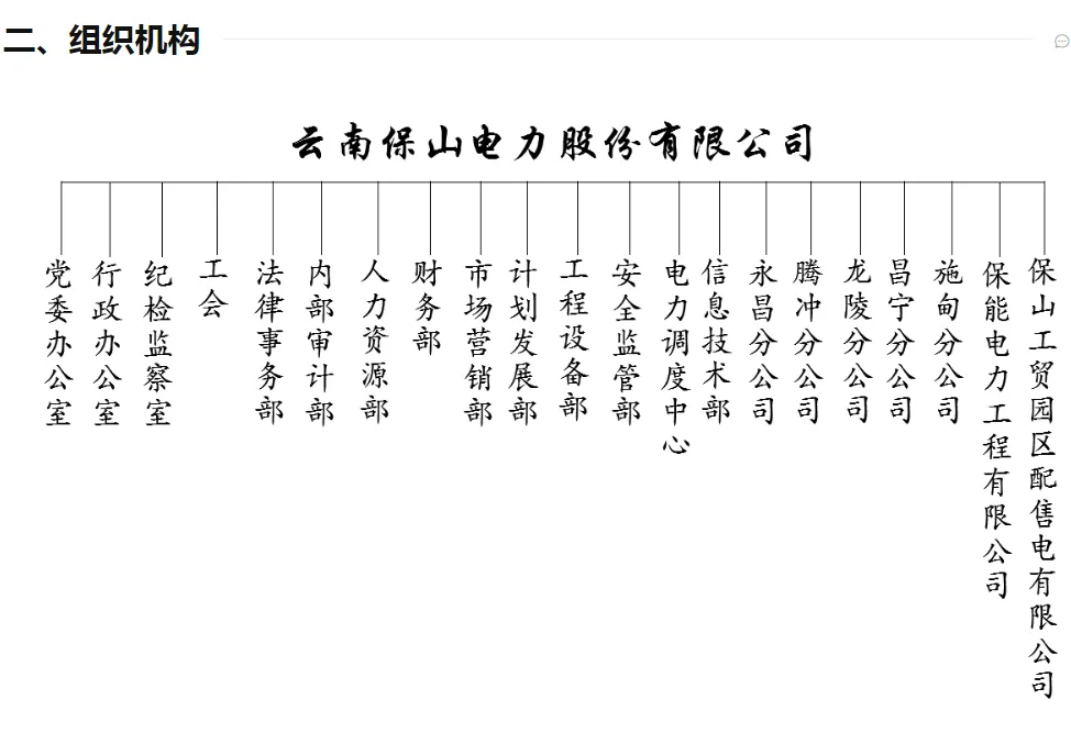 云南保山电力股份有限公司于1996年10月挂牌成立,隶属保山市委、市政府,是以市(县、区)国有电力资产为纽带组建的地方国有电力企业。根据《云南省进一步深化电力体制改革试点方案》精神,2017年7月,实施“厂网分开”,将发电类资产从原电力公司剥离新组建能源公司,主营发电资产,属发电企业。原电力公司名称续存,变更经营方向和范围,明确为电网企业。存续的电力公司,主营电网资产,负责保山市行政区划范围内的110千伏及以下电压等级电网的建设和运营管理(220千伏及以上电网由云南电网有限责任公司建设运营,工贸园区供电业务由保山工贸园区配售电有限公司建设运营),并为部分周边区域和境外局部地区提供供电。截至2020年底,有110千伏变电站34座,35千伏变电站63座,配电变压器1452台户一表985357户。形成110千伏电网与省网220千伏电网多点连接,110千伏电网为骨干辐射五县(区市)、35千伏覆盖所有乡镇的供电格局。2003年1月,保山电力公司将原九户国有电力存续企业全部撤销,实行整体式改制,以市(县、区)国有电力资产为纽带,组建为地方国有电力企业,负责承担全市水电开发建设和电力的发、输、配售等任务。2017年8月,为贯彻落实中共中央、国务院、省委省政府和市委市政府关于进一步深化电力体制改革精神,加快电力市场化进程,稳步推进保山市电力体制改革,公司实施厂网分离,将发电类资产从原云南保山电力股份有限公司剥离新组建保山能源发展股份有限公司,主营发电资产,属发电企业。原云南保山电力股份有限公司名称续存,变更经营方向和范围,明确为电网企业,从事电力输配、供应、调度、购销及其相关物资的批发零售、代购代销;电力工程投资、规划、设计、施工、改造及运行、维护、管理;电力线路架设安装、售电增值服务、电力电商服务、电力客户服务;充电桩(站)投资建设和运营管理。公司现有股东8户,股本总额26803.3万元,其中:保山市国有资产经营有限责任公司持股36.93%;腾冲县国有资产经营有限责任公司持股15.58%;龙陵县国有资产经营有限责任公司持股14.37%;施甸县国有资产经营集团有限责任公司持股12.46%;保山市隆阳区国有资产经营有限责任公司持股9.31%;昌宁县国有资产经营有限责任公司持股5.09%;云南省地方电力实业开发有限公司持股4.78%;中国三峡新能源(集团)股份有限公司持股1.48%。云南保山电力股份有限公司为保山市属国有企业,公司下设永昌、施甸、腾冲、龙陵、昌宁五个分公司。截至