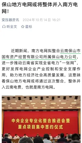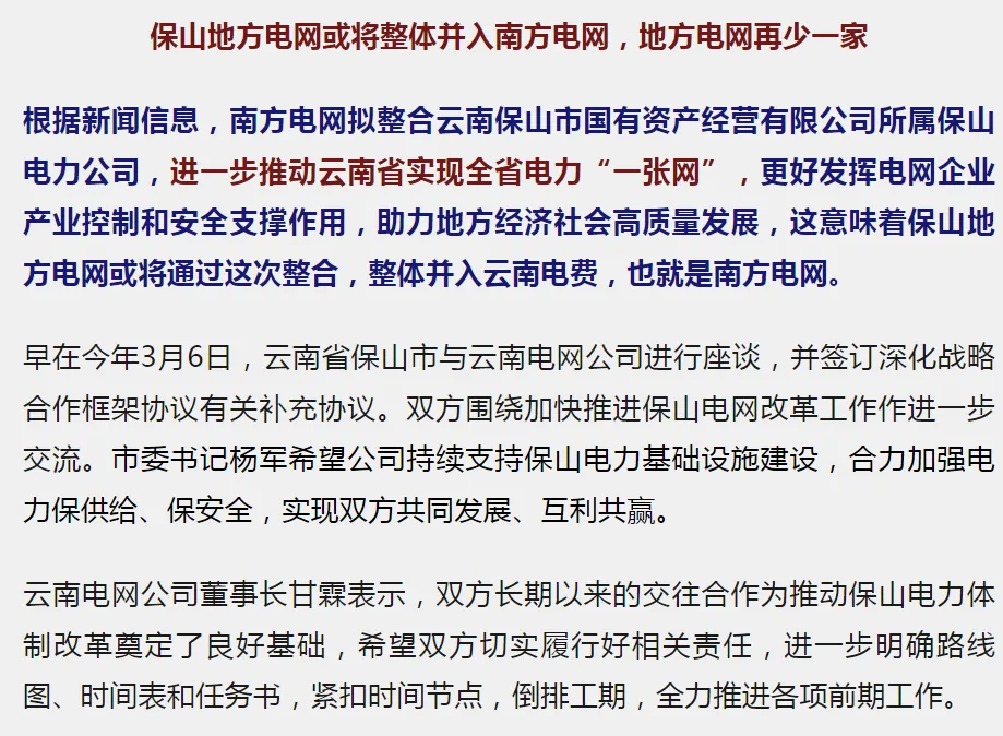 云南保山市国有资产经营有限公司旗下拥有保山市永昌能源开发有限责任公司、云南保山电力股份有限公司、保山能源发展股份有限公司、云南保山苏帕河水电开发有限公司等控股或参股电力资产。其中,云南保山电力股份有限公司属地方电网公司,经营范围为电力输配、供应、调度、购销及其相关物资的批发零售、代购代销;电力工程投资、规划、设计、施工、改造及运行、维护、管理;电力线路架设安装;售电增值服务;电力电商服务;电力客户服务;充电桩(站)投资建设和运营管理,与南方电网主营业务重合。