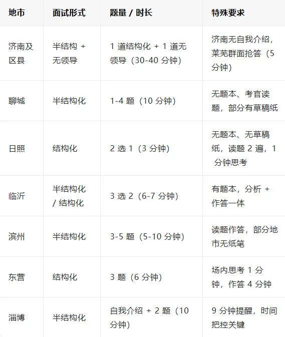 - 补充形式:结构化面试(部分地市采用,固定题本 + 限时作答)、无领导小组讨论(济南及周边区县常考,30-40 分钟团队协作答题)