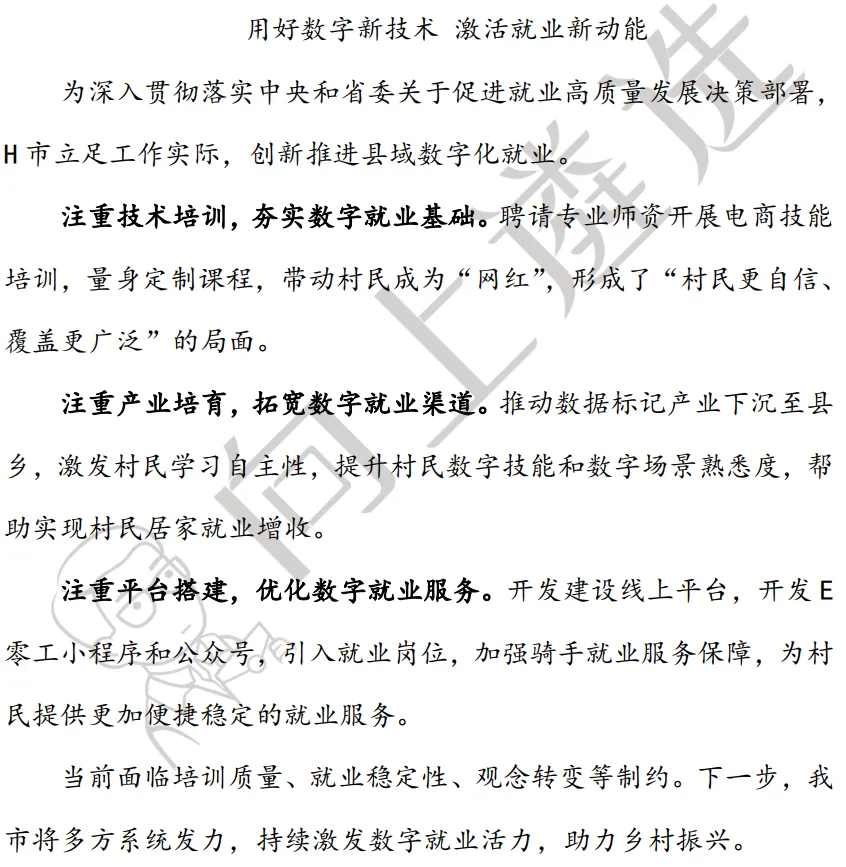 问题1:请依据材料,写一篇H市县域数字化就业发展的信息简报,400字以内,15分。