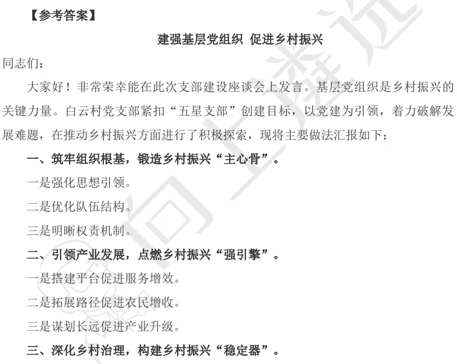 白云村驻村书记要在支部建设座谈会上进行交流发言,请你以“建强基层党组织,促进乡村振兴”为题,写一篇发言稿,800-1000字,35分。