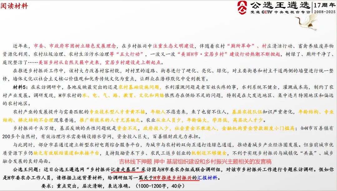 此次吉林遴选笔试,公选王精准预测到了所有考点。数字吉林建设、夜经济、高质量充分就业、以及基层组织建设和乡村振兴主题相关的发言稿。