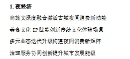 四是配套服务情况。聚焦夜经济中停车、如厕、垃圾处理、交通保障等问题,调研各地解决服务配套短板的有效做法,借鉴各地优化配套、提升服务体验的经验,提出本地需要重点配套的短板。