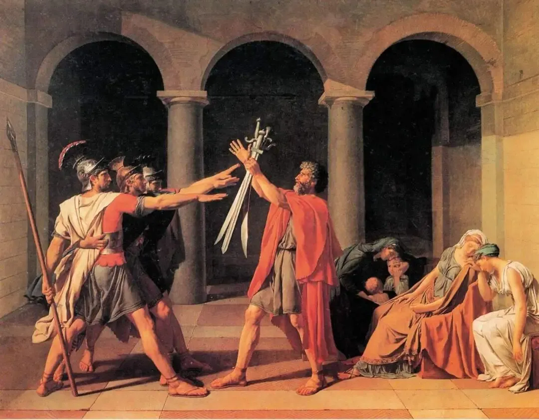 《荷拉斯兄弟之誓》故事背景是古罗马时期,公元前7世纪,罗马王位传到了第三任国王。这位国王崇尚武力,不断扩张罗马城,于是就与邻邦阿尔巴王国发生了冲突,造成两国之间纷争不断。解决办法为两国各派出三个勇士,三人一组展开一场公开的角斗,胜者为王,失败的国家将臣服于胜利的国家。罗马推举出来的是老贵族荷拉斯(Horace)家族的三兄弟。这幅画描绘了神话中的荷拉斯三兄弟在出征前宣誓的场景。画面分为三个部分:中间是老荷拉斯,他手持利剑,表情坚毅;左侧是荷拉斯三兄弟,他们穿着战袍,伸手接受父亲手中的利剑,展现出誓死如归的英雄气概;右侧是一群女眷,她们悲痛欲绝,掩面而泣。人物的表情和动作都非常激昂,突出了坚定的战斗精神。画面色彩庄重典雅,烘托出悲壮的情绪。人物造型和比例准确,动态和面部表情刻画得生动细腻。