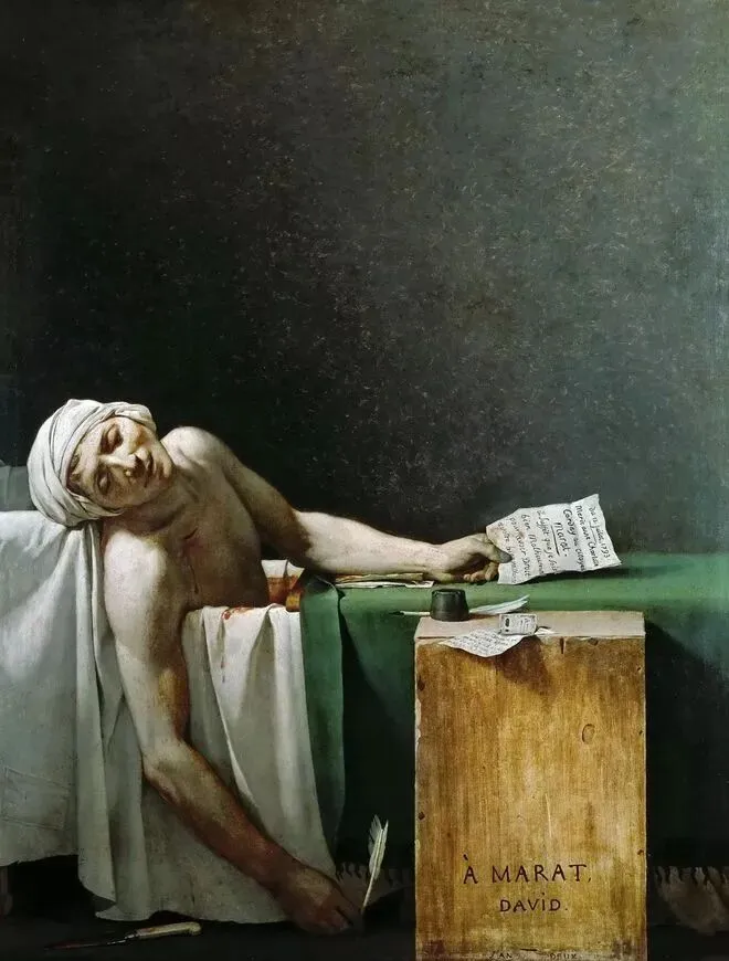 《马拉之死》是大卫的一幅油画肖像画,它因马拉的特殊身份和简洁有力的形式而为人们所熟知,表现的就是马拉在浴缸中被刺死后的场景。马拉(Marat,1743-1793)是法国雅各宾派的核心领导人之一。雅各宾派当政以后,他因为卓越的号召能力而成为该派的主席,但同时也是一个残忍嗜血的活动家,往往不经审判便将政敌送上断头台。他患有严重的皮肤病,每天只有泡在洒过药水的浴缸中才能缓解痛苦,于是,浴室就成了他最经常待着的办公场所。1793年7月11日,一位反对暴政的女士夏绿蒂·科黛借口商谈事宜,进入马拉的浴室,并在他毫无防备的情况下行刺,结束了这位暴戾政客的生命。