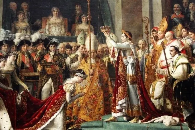 《拿破仑一世及皇后加冕典礼》忠实记录了拿破仑一世于1804年在巴黎圣母院隆重举行的国王加冕仪式的过程。为了巩固帝位,拿破仑这位皇帝极其傲慢地让罗马教皇庇护七世亲自来巴黎为他加冕,目的是借教皇在宗教上的巨大号召力,让法国人民以至欧洲人民承认他的合法地位,在加冕时,拿破仑拒绝跪在教皇前让庇护七世加冕,而是夺过皇冠自己戴上,画家为避免这一事实,煞费苦心地选用皇帝给皇后加冕的后半截场面,这样,既在画面上突出了拿破仑的中心位置(拿破仑站起来给皇后加冕),又没有使教皇难堪。画面中心形象是拿破仑从教皇手中接过的王冠,赐给皇后约瑟芬。