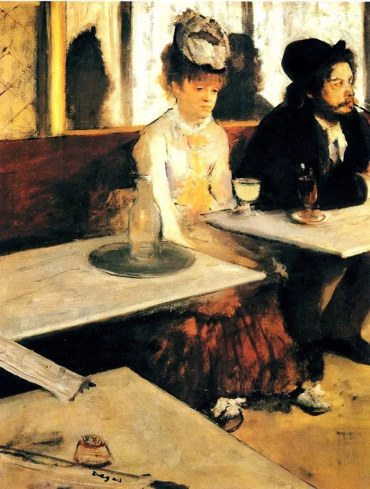 画中右侧男子是画家朋友台斯色丹,左侧女子是演员爱伦·安德雷。这幅画是德加为穷困潦倒的朋友画的一幅富有性格特征的肖像。画面笔触粗犷,生动而简练地刻画了两人漠然、无力的精神状态,一杯苦艾酒,衬托出两个失意人的苦楚。画面构图奇特,人物被挤到右上角,大部分空间用来描绘酒吧陈设,这种空旷感与人物的失落感相映成趣,被人誉为是一幅有思想性的叙事画。