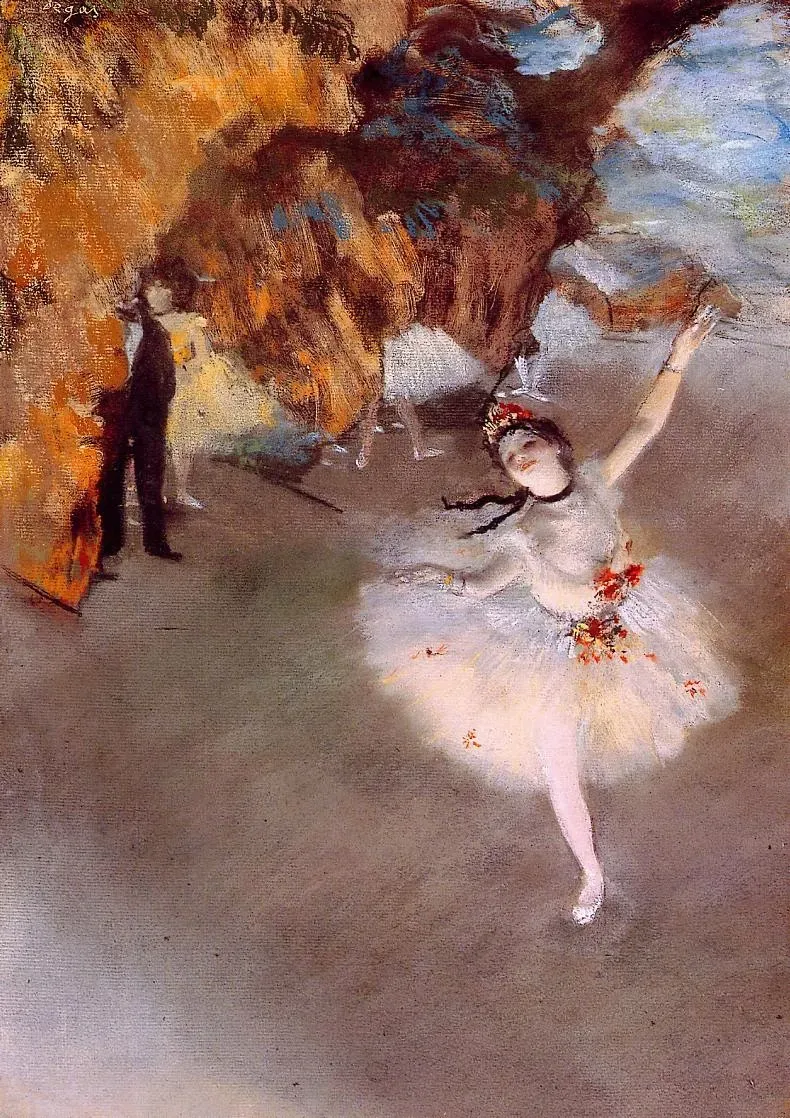 德加,是法国著名的印象派画家。曾在巴黎艺术学院学习绘画,受到安格尔很大影响。德加对素描有天生的爱好,他喜欢纤细、连贯而清晰的线条,认为这种线条是高雅风格的保证和达到他所倾慕的那种美的唯一方法。德加坚信艺术必须服务于真理,勘透繁华之后的孤寂与疏离,刺穿欢乐的面纱,直击真相本身,揭示出表面关系下掩藏的深层情绪。他最著名的绘画题材包括芭蕾舞演员和其他女性,以及赛马。(其作品的主题多以人像与舞蹈为主,尤其是芭蕾舞相关的作品占他作品总数的一半以上。)