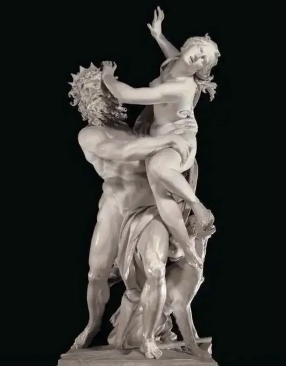 这是一件大理石圆雕作品,贝尼尼精准捕捉了人物关系的瞬间动作,展示了高超的写实技巧。大理石的材质使雕塑表面光滑细腻,形象生动,比例和谐。优美的造型表现了激烈的冲突,使整个雕塑极具张力。