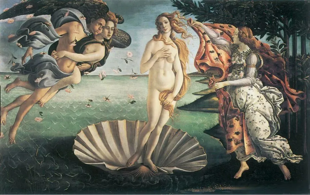 《维纳斯的诞生》画作以希腊神话中维纳斯从大海中诞生的故事为主题,描绘了维纳斯站在贝壳上从爱琴海中诞生,即将抵达塞浦路斯岛的场景。