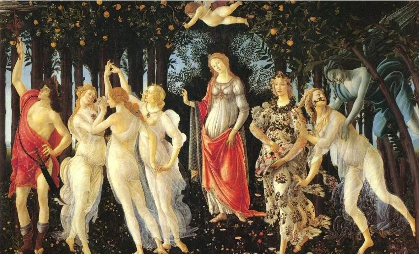 《春》画面所描绘的是,清晨一群美丽的女仙来到橘树林里。在前面带路的是鞋子上长了翅膀的众神使者梅尔库里,他手中拿着蛇杖。跟随着他的是“美丽”、“青春”、“欢乐”三女神,他们手挽着手且行且舞。接着,是位居画面中央的爱神维纳斯,她右手轻举,好象在指点上面的小爱神丘比特盲目发箭。维纳斯左边的则是春神,她把花神芙洛尔口里所吐出的花朵沿途撒播。花神后面为西风之神塞菲尔,他的相貌看起来灰暗丑陋,好像严冬在催促春光迅速流逝。《春》通过寄托于维纳斯的“人性”,表现了风神和克洛莉斯所体现的肉体的爱与三爱神所表现的精神上的爱,以及两者的和谐。