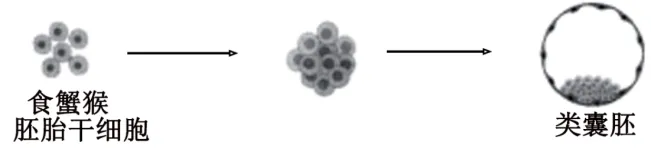 11. 我国科学家体外诱导食蟹猴胚胎干细胞,形成了类似囊胚的结构(类囊胚),为研究灵长类胚胎发育机制提供了实验体系(如图)。相关叙述错误的是(