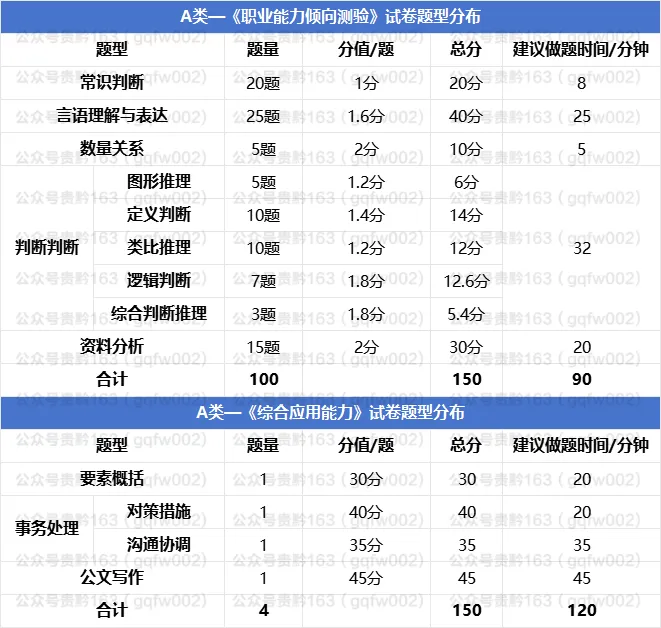 《综合应用能力(A类)》试卷由注意事项、背景材料和试题三部分组成,全部是主观性试题。试题内容主要涉及事业单位管理岗位典型的工作任务,如观点归纳、资料分类、草拟信函、会务安排、应急处理、联络通知等。主要为案例分析题和应用文写作题两大类型。更多事业单位信息关注公众号:贵黔163