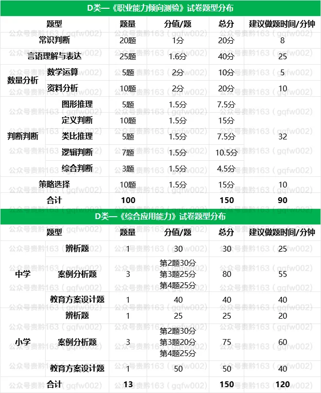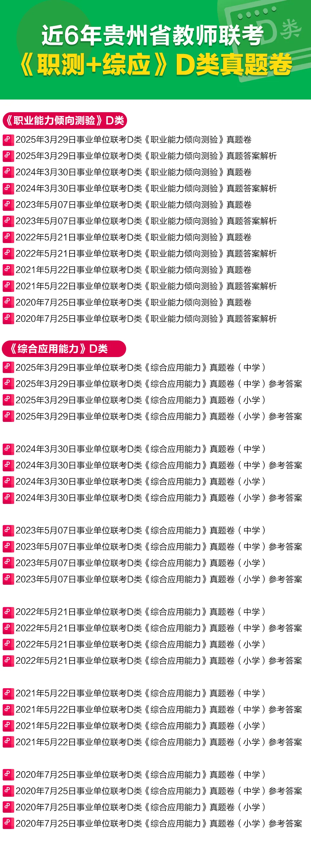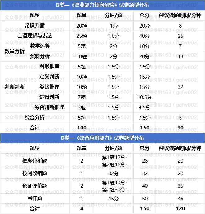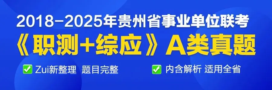 👇点击下方卡片关注公众号后台回复关键词【联考真题】✍下载近8年贵州事业单位职测+综应A类真题✅适用于:事业单位人文社科类专业技术岗位。比如经济、新闻、出版编辑、公证员、馆员、会计、广电播音、工艺美术等岗位。✅招聘专业:主要有会计学、体育学、教育学、历史学、外国语言文学、新闻出版、数字媒体艺术等相关专业、哲学、中国语言文学、美术及摄影、设计学、舞蹈学、戏剧与影视、艺术理论、音乐学、法学、民族学、社会学、政治学类、马克思主义理论类等。《职业能力倾向测验(B类)》分为:常识判断+言语运用+数量分析+判断推理+综合分析,各科目分值共150分。