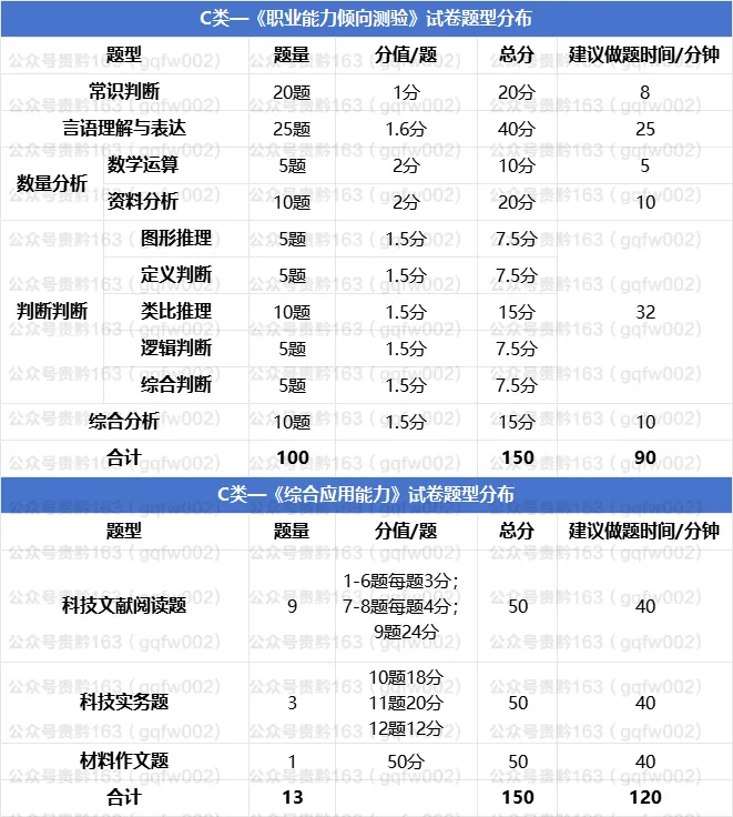 ✅适用于:事业单位自然科学类专业技术岗位。比如工程、农技、统计、民航飞行、关务员、实验员、技工学校教师等岗位。✅招聘专业:主要有计算机科学与技术、水利水电工程、植物生产类、土木工程、土木类、农业工程类、化学类、机械设计制造及其自动化、建筑学、农学、农业技术类、大气科学类、机械类、水利类、生物学、食品科学及工程、数学、水利水电水工、天文及大气科学、统计学、物理学、公安技术等。《职业能力倾向测验(C类)》分为:常识判断+言语运用+数量分析+判断推理+综合分析,各科目分值共150分。