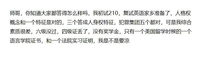 近三年重新回归线下复试,其中包含专业课笔试、专业课面试、英语口语。2025年面试进考室后,先回答英语口语,再自己从1-50号选择一个号码,老师把对应的题号题目读给你,然后你开始作答。非法学是一道民法、一道刑法,如果不会,可以申请和老师说换一道题目。该题库在资料里面有收录,备考后期需要重点背诵