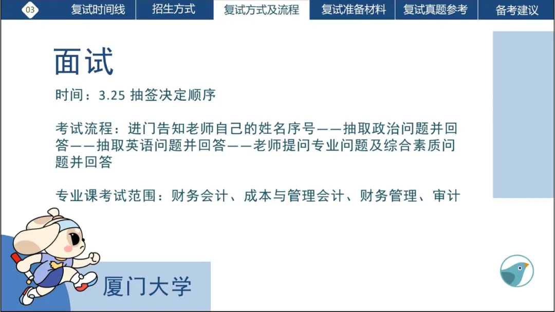 斑鸠厦门大学MPAcc复试班,以财经案例攻坚+低进高出逆袭体系为核心,精准踩中厦门大学复试「主观化+深度思辨」特点,院校专属定制辅导,帮你稳扎稳打拿下复试,逆袭上岸厦门大学!