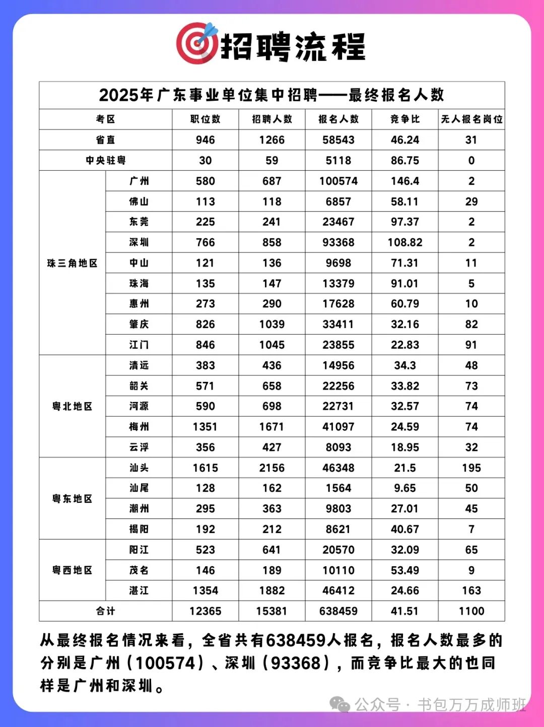 全省各级事业单位招聘工作人员11066名。应聘人员可通过广东省人力资源和社会保障厅网站(http://hrss.gd.gov.cn)、广东组织工作网(https://www.gdzz.gov.cn)、广东人事考试网(http://rsks.gd.gov.cn)查阅具体的招聘单位、岗位、人数和资格条件(附件1)。招聘对象为普通高校、职业学校、技工院校毕业生。其中:(一)2026届国内普通高校、职业学校、技工院校毕业生(非在职)须于2026年9月30日前取得相应毕业证书、学位证书及岗位要求的其他证明材料。(二)在境内就读的2026届中外合作办学毕业生(非在职)须于2026年12月31日前取得相应毕业证书、学位证书及岗位要求的其他证明材料。(三)其他应聘人员须于面试资格复审前取得相应毕业证书、学位证书及岗位要求的其他证明材料。【重要信息梳理】(一)报名时间:网络报名,2026年2月2日9:00至2月6日16:00登录“广东省事业单位公开招聘信息管理系统(考生报名)”(https://ggfw.hrss.gd.gov.cn/sydwbk,以下简称“招聘系统”)报名。报名事宜详见系统中的《系统报名指南》。2026年2月2日至2月4日每天10时、16时前后系统将发布各岗位报名的人数。报名时间截止后3个工作日内,系统将公布各岗位报名总人数。(二)报名确认:2026年2月26日9:00至2月27日16:00登录招聘系统确认是否参加笔试。未按规定时间进行确认的应聘人员报名不成功。(三)打印准考证:准考证打印时间将在广东省人力资源和社会保障厅网站、广东人事考试网另行公告。准考证是参加本次公开招聘的重要证件,请应聘人员妥善保管。(四)笔试时间:笔试于2026年3月举行,具体安排将在广东省人力资源和社会保障厅网站、广东人事考试网另行公告。(五)笔试成绩公布:笔试成绩将在笔试结束后20个工作日内通过招聘系统统一公布,应聘人员登录系统查询本人笔试成绩及岗位排名。(六)资格复审:面试或者直接业务考核前,事业单位或者其主管部门对入围面试或者直接业务考核人员进行资格复审。资格审查贯穿公开招聘全过程。(七) 面试组织:面试由事业单位或者其主管部门根据岗位需要,采取结构化面试、试讲、业务考核和技能测试等方式组织进行。面试组织单位将以适当方式通知入围面试人员参加面试,并在相关门户网站公布面试时间、地点等有关事宜。(八)直接业务考核组织:事业单位或者其主管部门成立同行专家考核组对应聘人员进行直接业务考核。事业单位或者其主管部门将以适当方式通知入围直接业务考核人员参加考核,并在相关门户网站公布考核时间、地点等有关事宜。(一)2026广东统考教师岗2870人,岗位集中在湛江、梅州、江门、汕头、肇庆。语文566人,数学523人,英语328人,体育187人,美术54人,音乐42人,道法+政治150人,地理109人,历史132人,化学92人,物理173人、生物70人、信息技术47人、幼儿115人、心理58人、科学15人、特教45人、日语3人、舞蹈6人、中高职75人。统考相对本地教育局单招来说,不仅招考量大,而且全省分流,会好上岸很多。教师岗每年进面分数低,往年进面分数65+大部分岗位都能进面。本次公开招聘考试一般采取“笔试+面试”方式进行,部分岗位采取面试或者直接业务考核方式进行。所有岗位笔试都是考察行测和公基,90分钟100题,单选+多选+判断,全省同一套试卷。2月2日开始报名,3月份进行笔试,大概率是3月中下旬考试。第一,公基部分