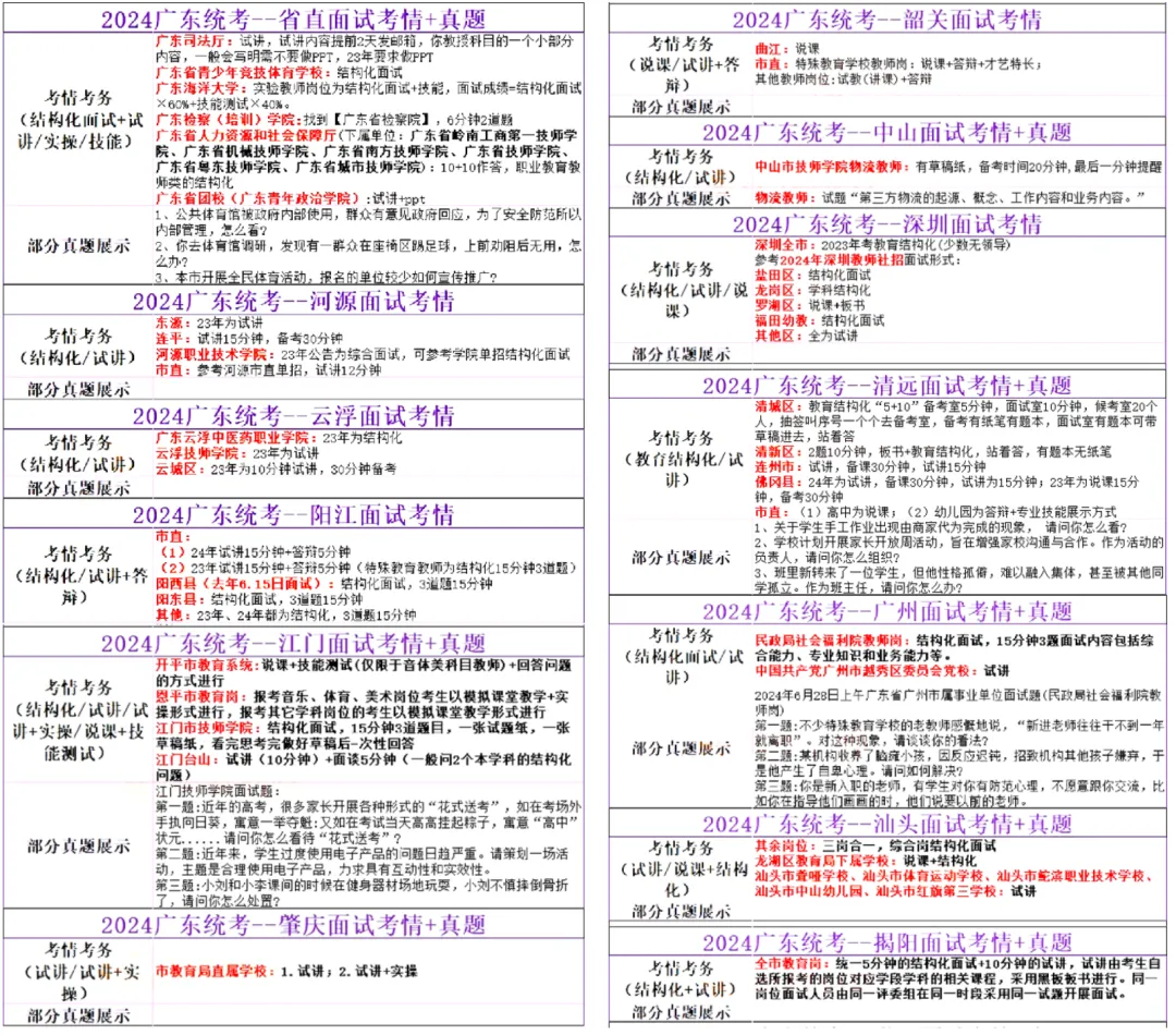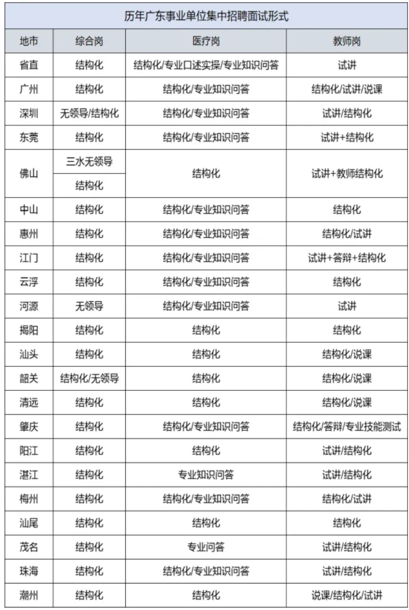 主要包括:言语理解与表达、数量关系、判断推理、资料分析,其中近两年考试中言语理解与表达、判断推理题量占比较大。(1)选词填空:主要考察语境分析和词语辨析,突出对两者的综合考查。考查的词语类型包括实词、成语和虚词。(2)阅读理解:主要考察主旨题、细节题、标题添加题、推断下文题、句子排序题和句子填空题等。(1)数字推理:主要考察数列类,考点集中在等差数列、等比数列、和数列、组合数列。(2)数学运算:侧重考查和差倍比的计算问题、工程问题和排列组合问题,也涉及行程问题、浓度问题、几何问题、日期问题等。近三年数学运算每年考察10题。(1)图形推理:平面图形考察移动、叠加、对称性、线条数、封闭区域数、平面图拼接等考点,立体图形考察三视图、六面体折纸盒、立体图拼接等。(2)类比推理:主要考察近反义关系、顺承关系、短语结构、功用关系、职业关系等考点。近三年类比推理每年考察5题。(3)逻辑判断:可能性推理中,前提型、解释型是考察重点,削弱型、加强型、相似结构评价型也有考察。必然性推理中,复言命题和朴素逻辑为重点。近三年逻辑判断每年考察10题。4.资料分析:侧重考察对于基本公式的应用,增长和比重占比较大。近三年资料分析每年考察10题。链接:https://pan.quark.cn/s/d3dbeaeb48fa根据往年情况,广东事业单位统考从发布笔试成绩的公告到各地区进行面试的安排,间隔时间在两周左右,即半个月,显然,备考时间是非常紧张的,基本就是马上学习马上考试,因此,各位同学,面试要提前准备!🎒书包邀约