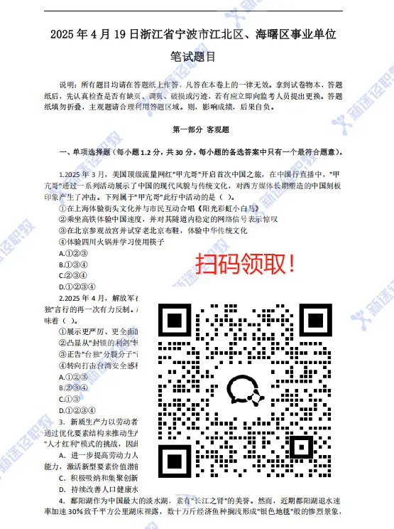 今日分享2025年4月19日江北区、海曙区笔试真题