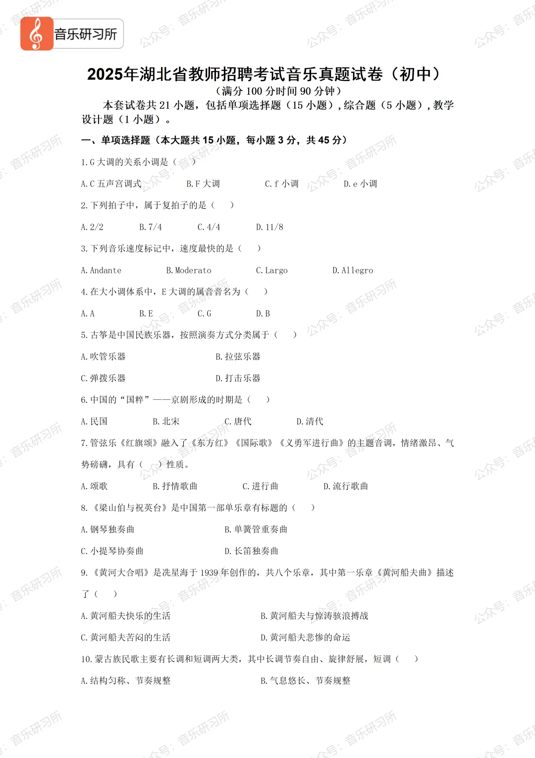 >2025年湖北省教师招聘考试音乐真题试卷(初中)