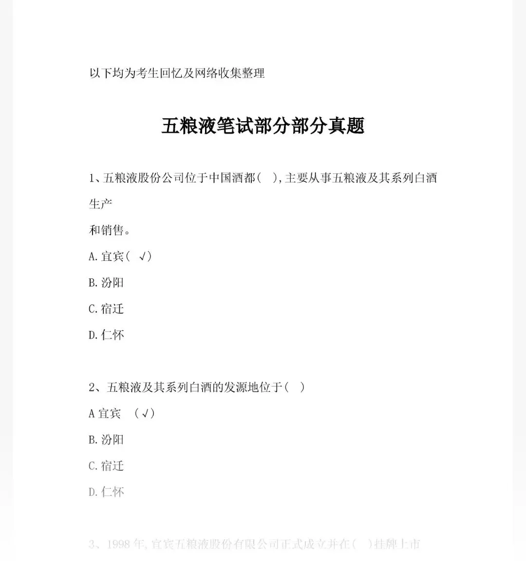 笔试内容:行测、五粮液酒文化、酒知识等、时政、五粮液企业文化