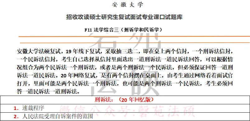 安徽大学法硕复试,2019年线下复试,采取抽三选二,即在桌上两个信封,一个刑诉法信封,一个民诉法信封,考生自己选择从信封里面选出一道刑诉法一道民诉法回答,可以根据情况组合为两个民诉法一个刑诉法,或者是两个刑诉法一个民诉法,但必须保证回答一道刑诉法一道民诉法。