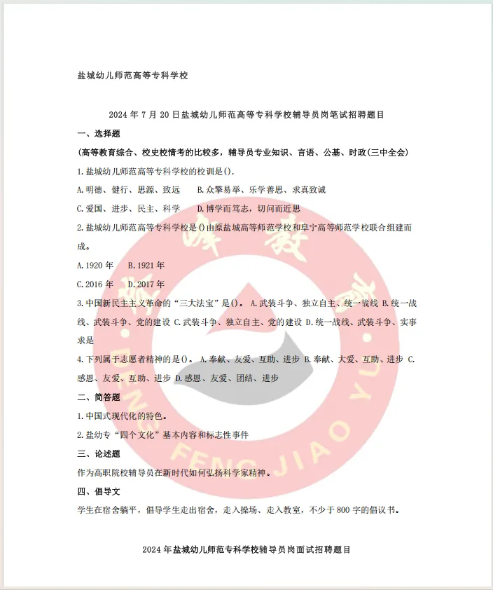 >【真题分享】盐城幼儿师范高等专科学校丨辅导员笔试真题+校史校情
