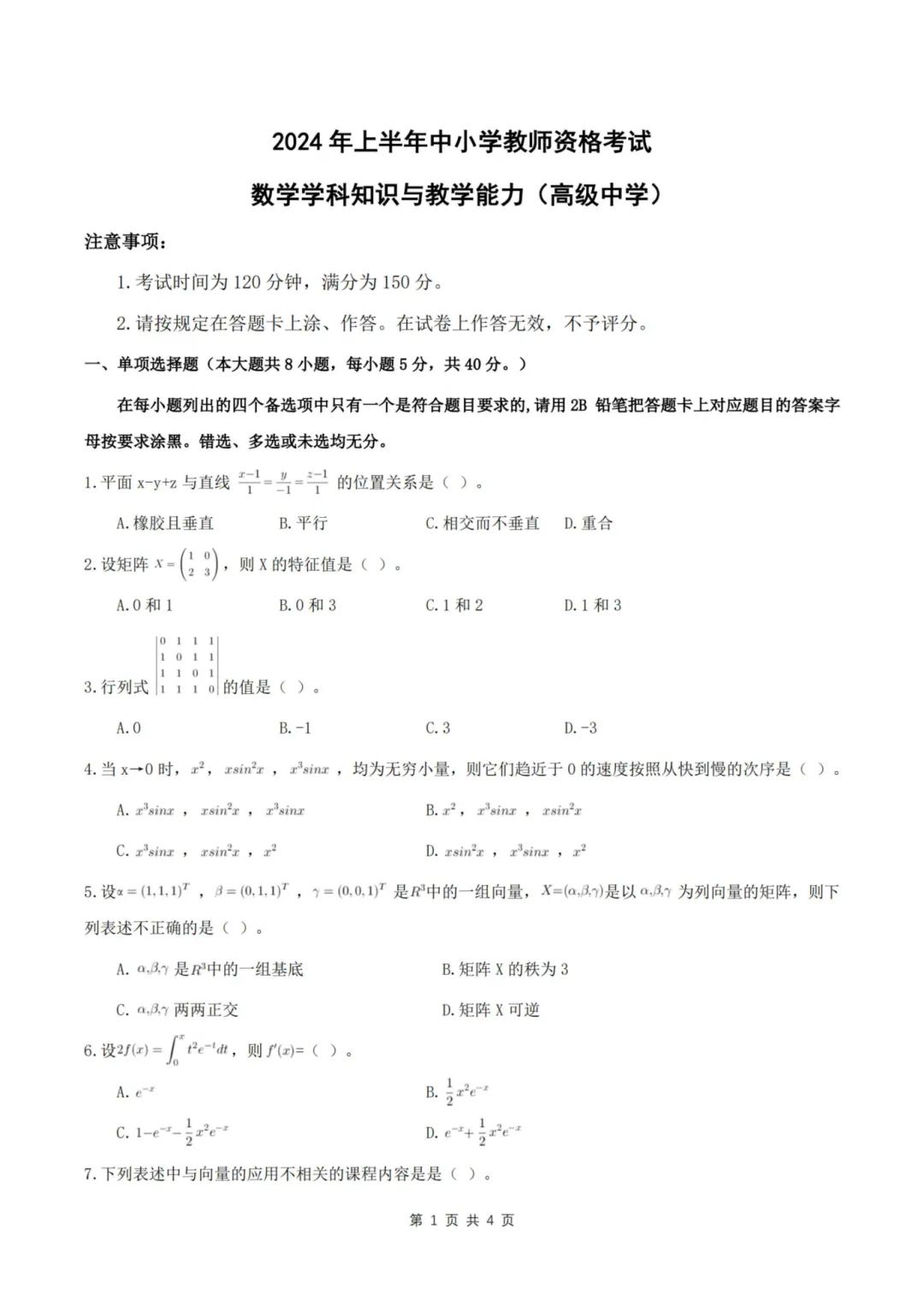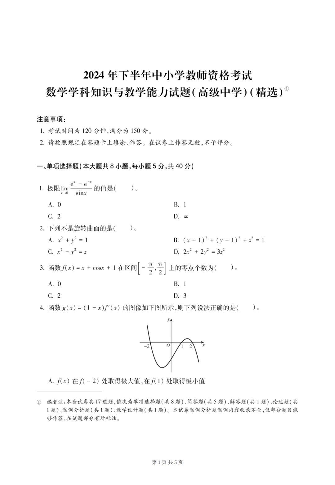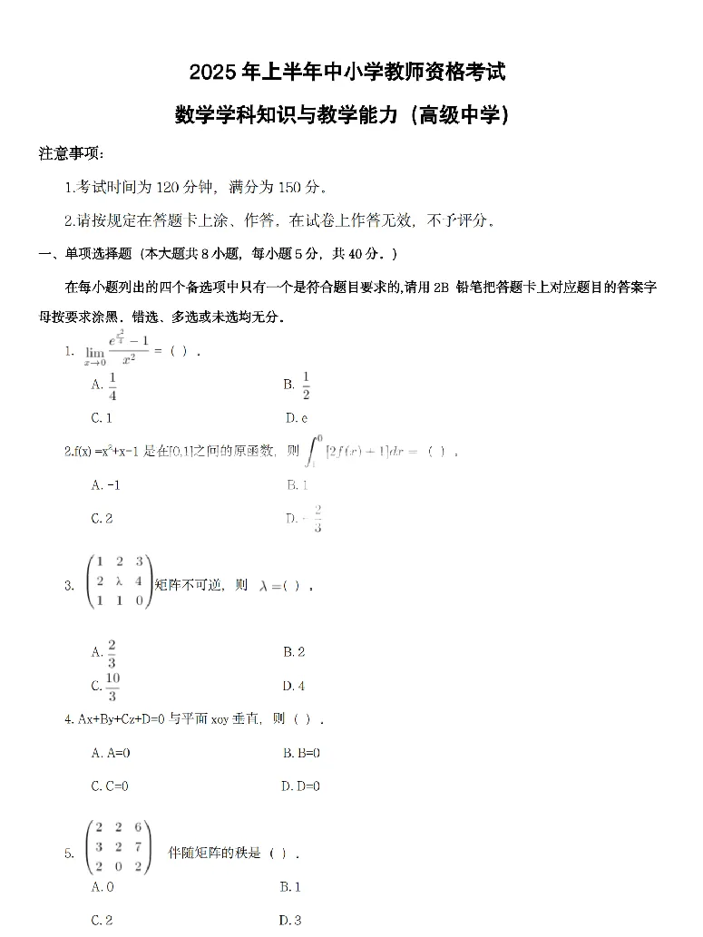 >26上教资笔试高中数学科三历年真题更新至25年含答案可打印