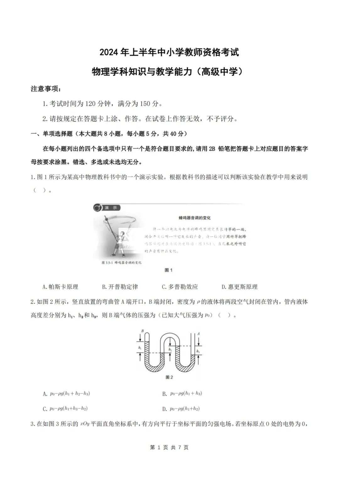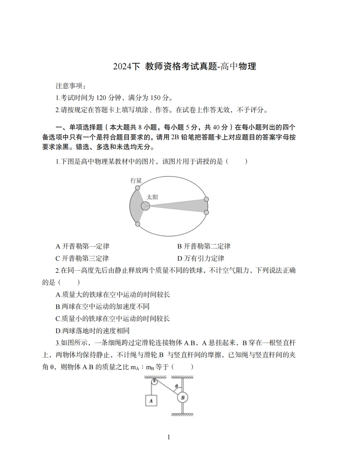 >26上教资笔试高中物理科三历年真题更新至25年含答案可打印