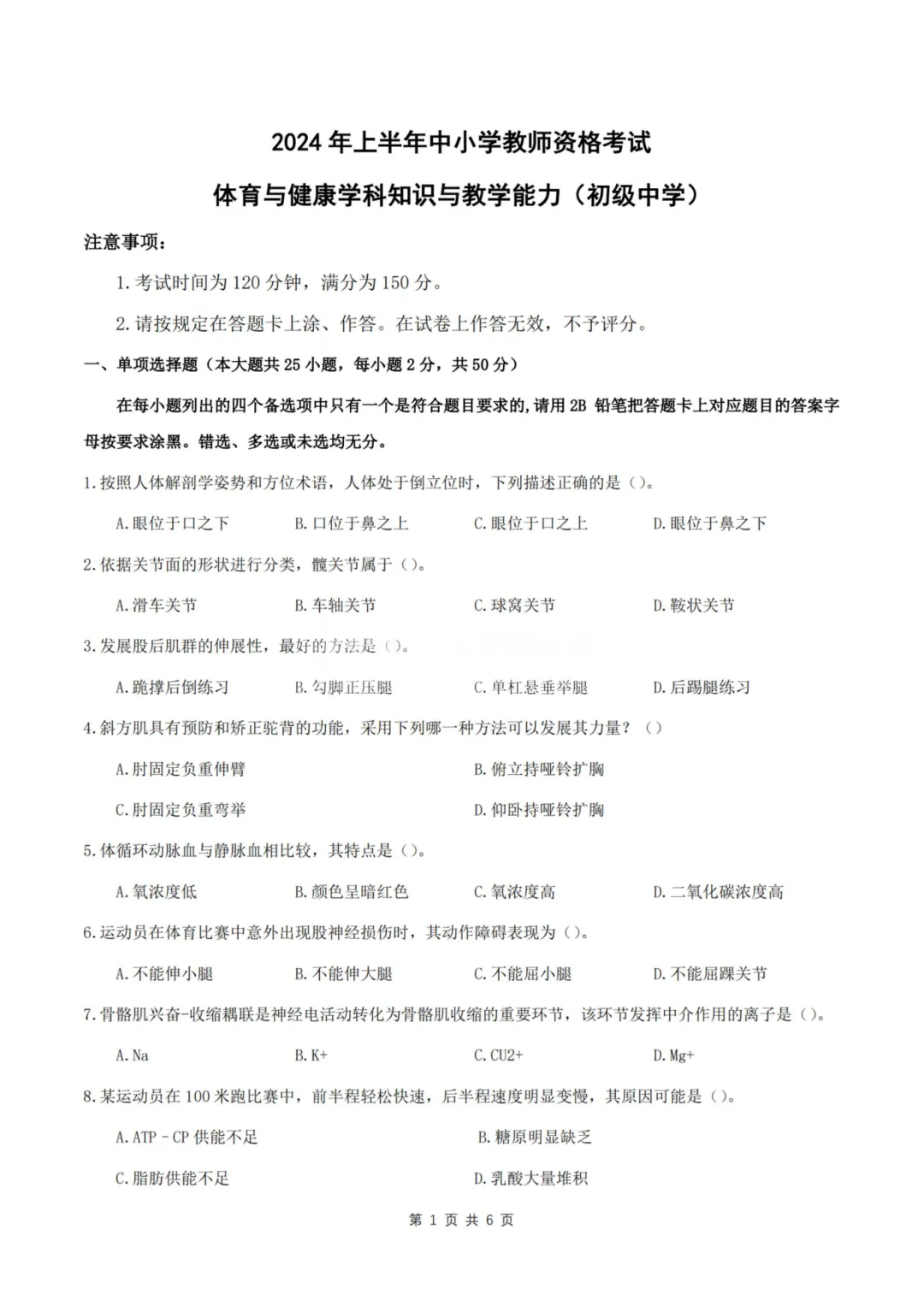 26上教资笔试初中体育科三历年真题更新至25年含答案可打印