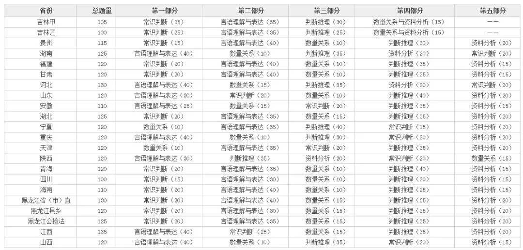 其他省份某几个省份大致一套试卷的情况依然延续,去年从试卷的重复情况看大致分八类,今年宏观上看,大概分为如下几类,分别是以吉林、山东、四川、河北、福建、江西、陕西、黑龙江为代表的,其中黑龙江不完全独立命题,与其他类有交叉。黑龙江县乡和公检法各增加了5道数量关系题。贵州总题量减少5道,由120减少到115题。试卷间题目交叉情况有所减少。
