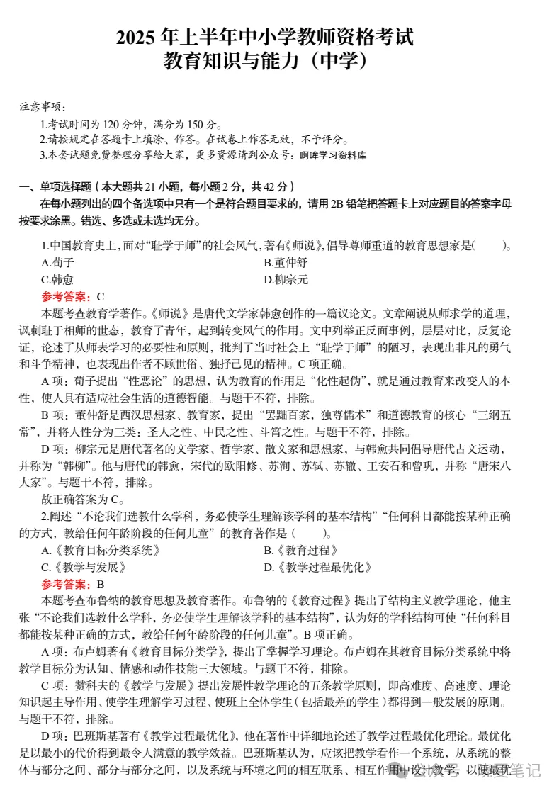 「302 教育知识与能力(中学)2025年上半年@真题卷.pdf」