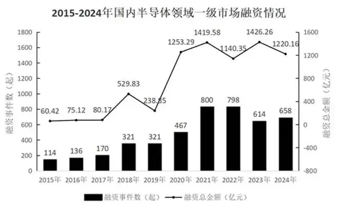 87.2015-2024年间,国内半导体领域一级市场融资总金额与融资事件数均同比上升的年份有几个?( )