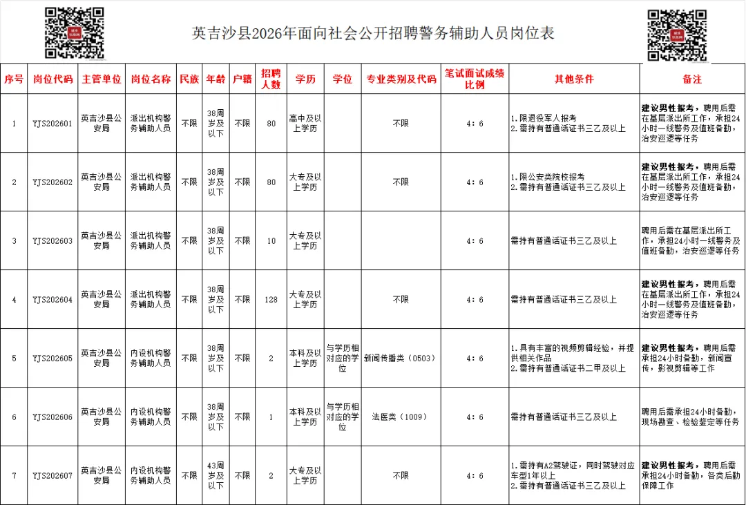 1.《英吉沙县2026年招聘警务辅助人员岗位表》