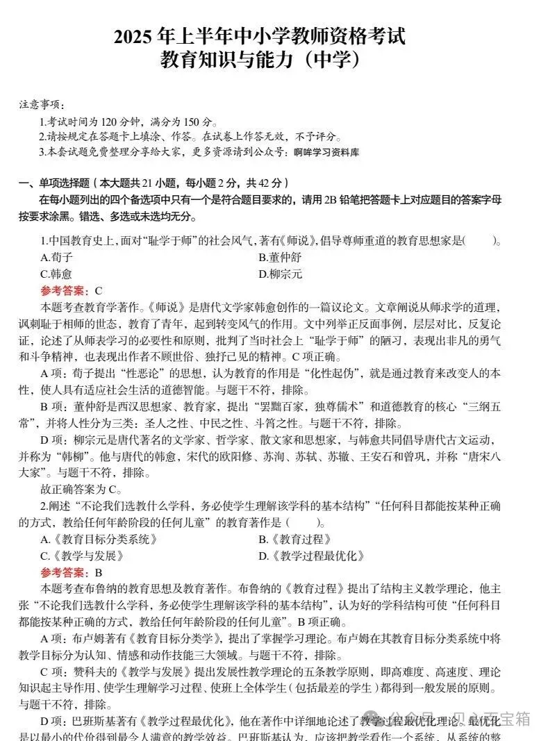 当前位置:首页>笔试真题>2025年中学教资笔试(科一+科二+科三)试卷+答案解析完整版+历年