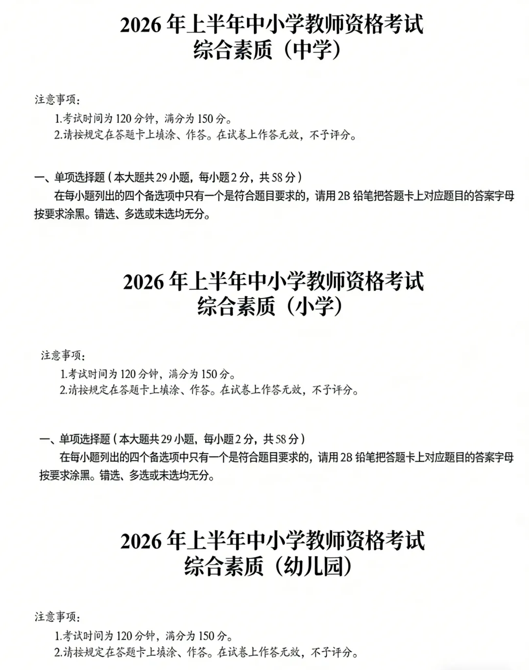 2026上教资笔试(幼儿园)科目一《综合素质》真题试卷和答案