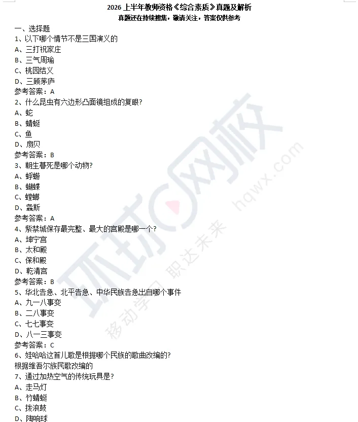 1、由于篇幅有限,仅展示部分内容,考生扫描下方二维码可免费领取>>2026上半年教师资格《综合素质》科目真题解析(电子版)