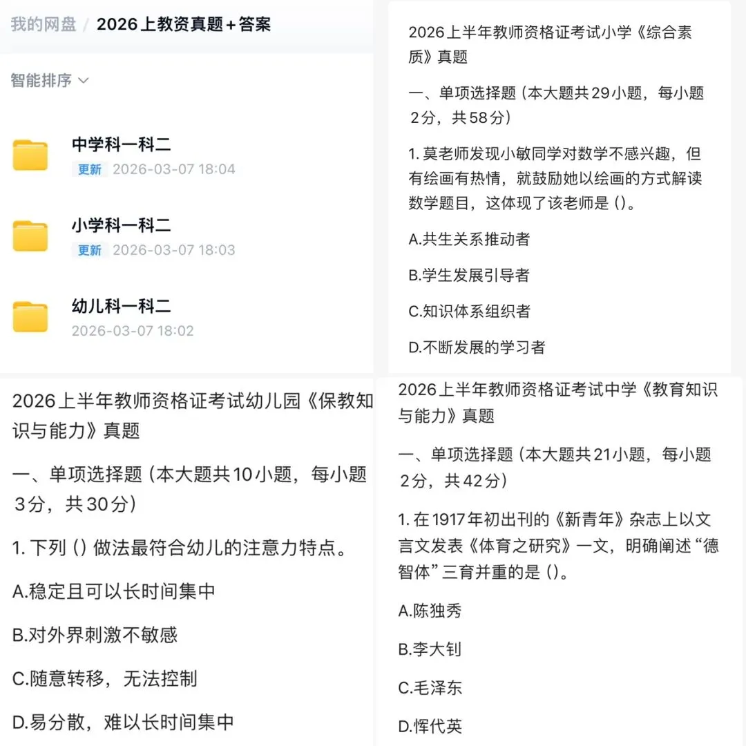 度盘只有科一科二真题及答案,科三答案在这里→2026上半年教资笔试科一、科二、科三真题试卷和参考答案
