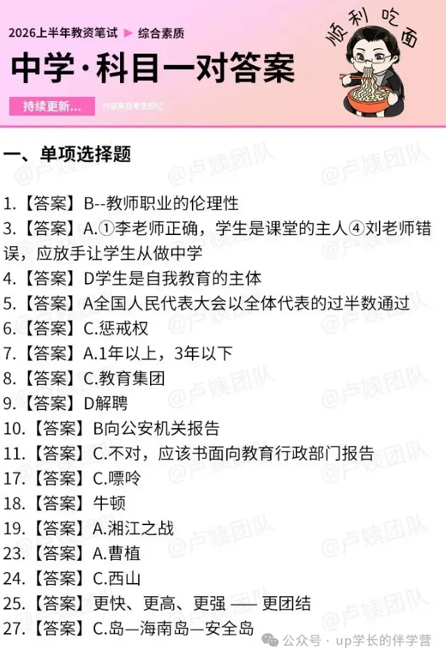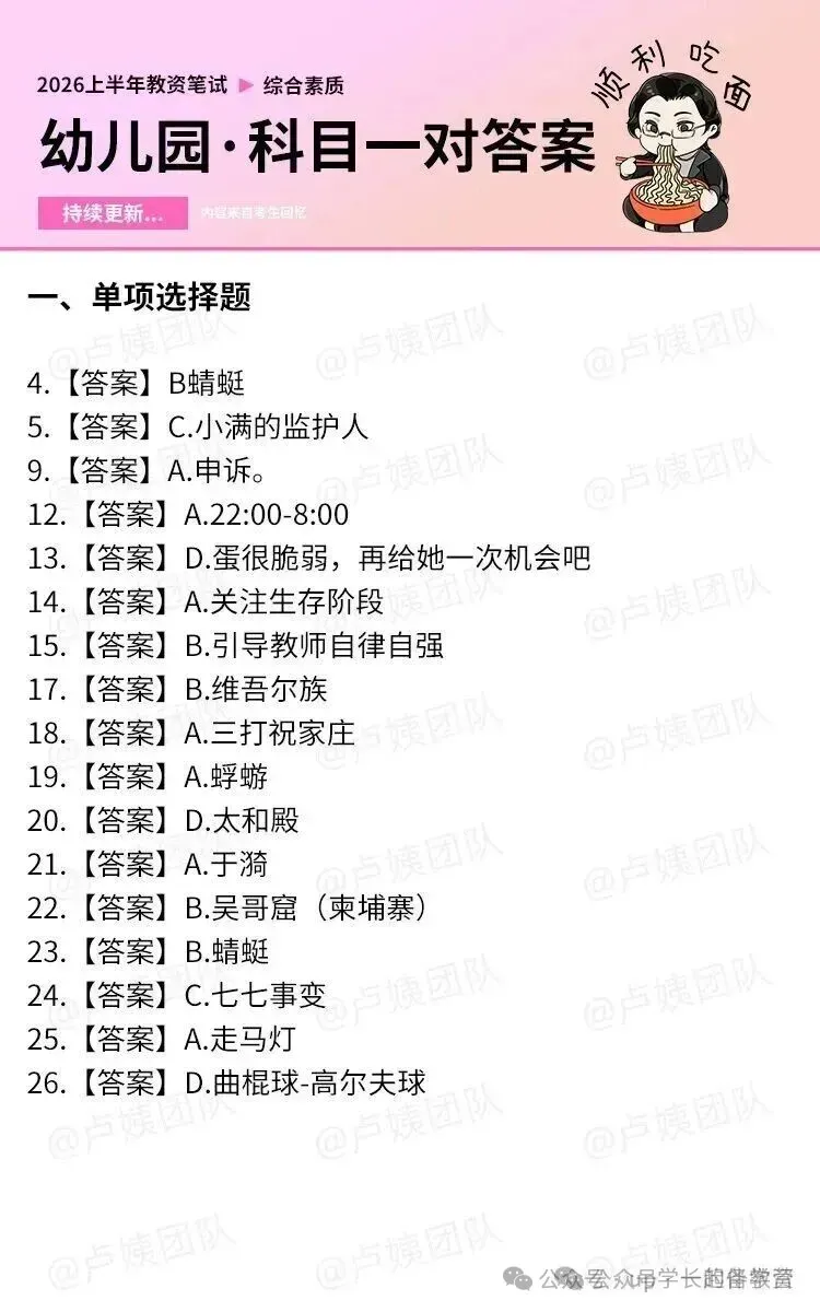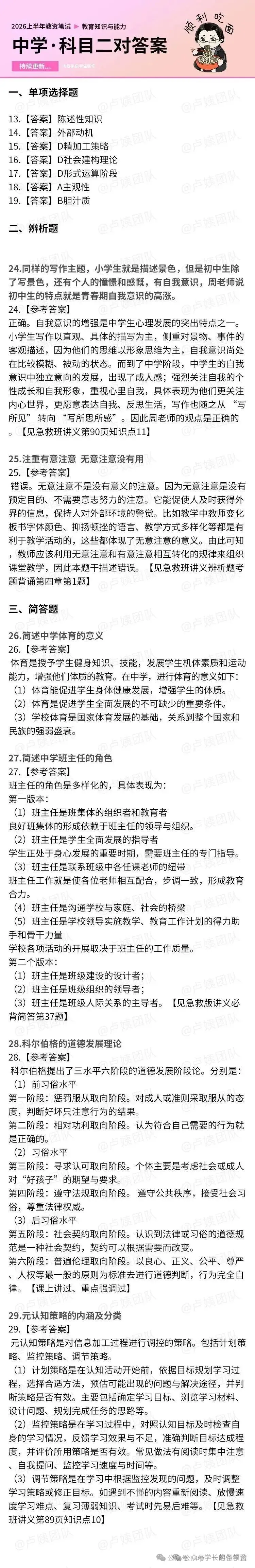幼儿小学初中高中职科一科二科三教全阶段26年3月教师资格真题和答案速对